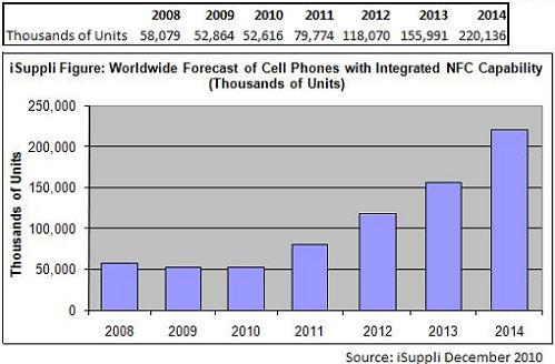 據(jù)市調(diào)機構(gòu)iSuppli預估,到2014年,全球內(nèi)建NFC的手機出貨量可望達到2.201億部,2010年該數(shù)字為5,260萬部。到了2014年,約有13%的手機內(nèi)建NFC功能,而2010年該數(shù)字為4.1%。