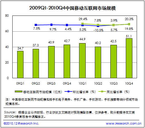 根據(jù)艾瑞咨詢即將發(fā)布的2010年第四季度中國移動互聯(lián)網(wǎng)市場監(jiān)測數(shù)據(jù)顯示,2010Q4中國移動互聯(lián)網(wǎng)市場整體規(guī)模達(dá)到51.1億,同比增長19.8%,環(huán)比增長20.3%。艾瑞咨詢分析認(rèn)為,本季度電信運(yùn)營商對計(jì)費(fèi)通道治理開始收尾,移動增值市場整體復(fù)蘇。同時(shí)手機(jī)電子商務(wù)、手機(jī)游戲業(yè)務(wù)領(lǐng)域取得良好市場表現(xiàn),受手機(jī)應(yīng)用商店、位置簽到服務(wù)等新型手機(jī)業(yè)務(wù)創(chuàng)新的帶動,移動互聯(lián)網(wǎng)規(guī)?傮w攀升,投融資比重增加。