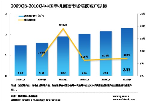據Enfodesk易觀智庫最新數據顯示,2010年第4季度中國手機閱讀市場活躍用戶數達2.33億,環(huán)比增長7.03%,同比增長幅度達44.60%。