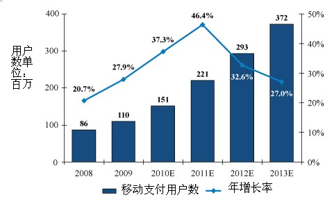 基于“中國計(jì)算機(jī)世界”的研究預(yù)測(cè),中國移動(dòng)支付用戶在2009年底達(dá)到1.1億,預(yù)計(jì)將在2013年超過3倍。由于需求大幅提高,電信運(yùn)營商會(huì)繼續(xù)在每個(gè)省推出移動(dòng)支付解決方案網(wǎng)絡(luò)。反過來,也會(huì)刺激第三方平臺(tái)和供應(yīng)商的發(fā)展。