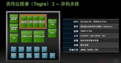 而英偉達圖睿Tegra 2就是專為移動市場而設(shè)計的超級芯片,Tegra 2雙核處理器采用了40納米工藝制程,有兩顆Cortex-A9處理器,主頻高達1GHz。Tegra 2處理器芯片只有1/4個硬幣大小,雙核以更低的功耗實現(xiàn)同等性能,多任務(wù)處理速度提升一倍,尤其是處理Flash以及HTML5的速度最快。