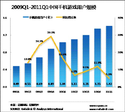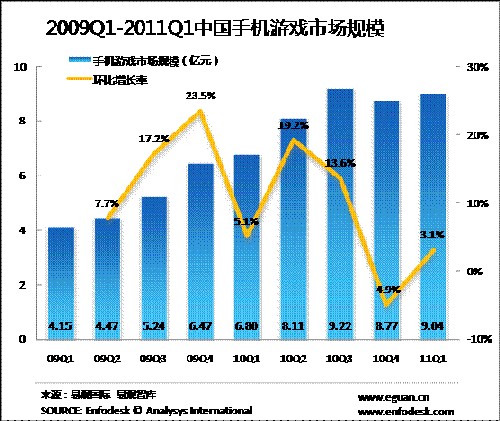 2011年第1季度手機(jī)游戲市場規(guī)模達(dá)9.04億元