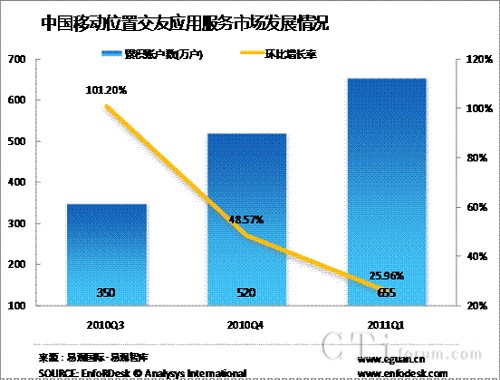 2011年Q1中國(guó)移動(dòng)位置交友應(yīng)用累計(jì)帳戶數(shù)達(dá)655萬(wàn)