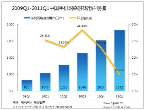 2011年第1季度中國手機(jī)網(wǎng)絡(luò)游戲市場規(guī)模達(dá)2.55億