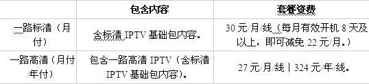 在IPTV的推廣上,江蘇電信也采取了和現(xiàn)有E家套餐捆綁的方式進(jìn)行推廣,F(xiàn)已推出高清IPTV服務(wù)。具體費(fèi)用見下表:
