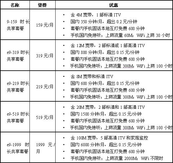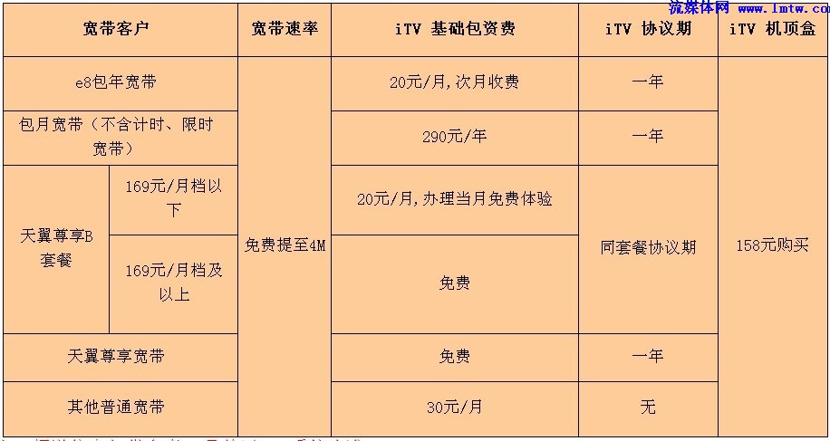 單獨(dú)辦理iTV,資費(fèi)30元/月;辦理4Me8套餐每月立減10元;辦理4Me9套餐和e家尊享套餐免費(fèi)贈(zèng)送。(資費(fèi)以當(dāng)?shù)貭I(yíng)業(yè)廳為準(zhǔn))