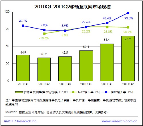 2011Q2中國移動互聯(lián)網(wǎng)市場規(guī)模達77.9億元