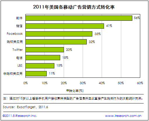 iResearch艾瑞咨詢整理ExactTarget調(diào)研數(shù)據(jù)時發(fā)現(xiàn):2011年在驅(qū)動美國手機(jī)用戶產(chǎn)生購買的移動廣告營銷方式中,電子郵件營銷的轉(zhuǎn)化率最高,達(dá)到56%,短信、Facebook、購物類手機(jī)應(yīng)用(如Amazon、eBay、Groupon)以41%、35%、32%的轉(zhuǎn)化率依次位居二、三、四位。