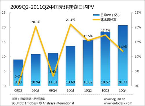 從無線搜索市場(chǎng)的PV來看,2011年第2季度中國(guó)無線搜索市場(chǎng)日均PV已經(jīng)突破24億次,環(huán)比上季度增長(zhǎng)為11.0%,增長(zhǎng)率相比上個(gè)季度開始反彈。
