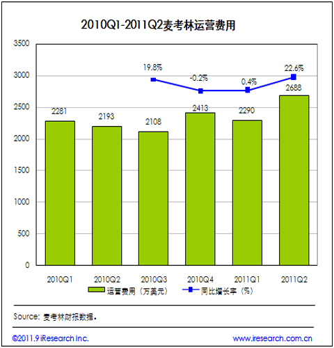 2011Q2麥考林運營費用為2688萬美元,同比增加22.6%。據(jù)麥考林CFO披露,2011Q2市場營銷費用收入的比例為14%,即822萬美元(2011Q1市場營銷費用收入比例為13%,即625萬美元,且60%用于線上渠道,40%用于呼叫中心渠道),行政與管理費用達到1774萬美元的水平。