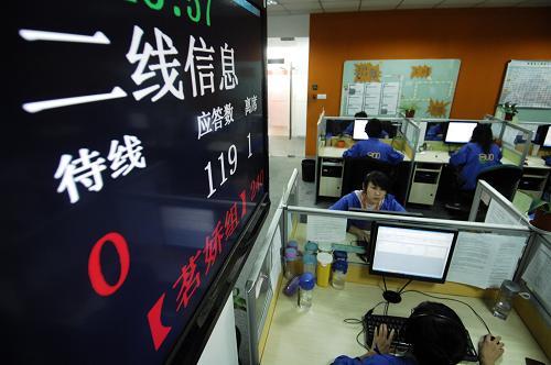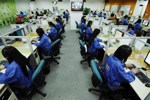 9月23日,商務城客服電話外包公司員工在呼叫中心為客戶提供外包客服電話服務。