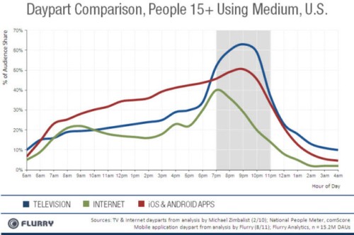 移動(dòng)分析公司Flurry的一項(xiàng)最新研究表明,和電視節(jié)目有黃金收視時(shí)段一樣,移動(dòng)應(yīng)用也有黃金使用時(shí)段,晚上7點(diǎn)左右是用戶使用移動(dòng)應(yīng)用的頂峰期。