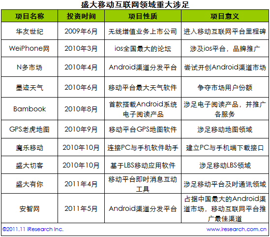 根據(jù)艾瑞咨詢整理的數(shù)據(jù)認(rèn)為,盛大一向秉持這“產(chǎn)業(yè)布局比產(chǎn)品開發(fā)更重要”的想法,縱觀盛大在幾年中對移動(dòng)互聯(lián)網(wǎng)的產(chǎn)業(yè)鏈建立,投資及開發(fā)項(xiàng)目可謂是星光奪目。