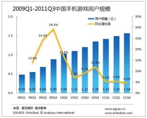 根據(jù)EnfoDesk易觀智庫產(chǎn)業(yè)數(shù)據(jù)庫最新發(fā)布的《2011年第3季度中國手機(jī)游戲市場季度監(jiān)測(cè)》數(shù)據(jù)顯示,中國手機(jī)游戲用戶規(guī)模穩(wěn)步增長,截止2011年第3季度達(dá)1.56億,環(huán)比增長4.6%。