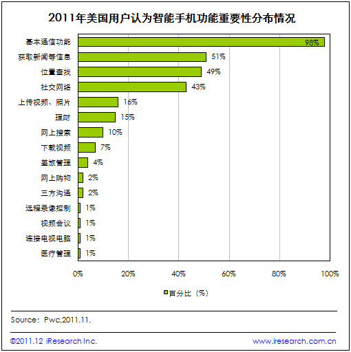 艾瑞咨詢根據Pwc近日發(fā)布的美國移動互聯網用戶演變研究報告發(fā)現,用戶對移動設備的使用和依賴程度增強,同時,通過對用戶使用智能手機功能的調查發(fā)現,用戶認為最重要的功能主要集中在基本通信、獲取資訊信息、位置查找和社交網絡上。