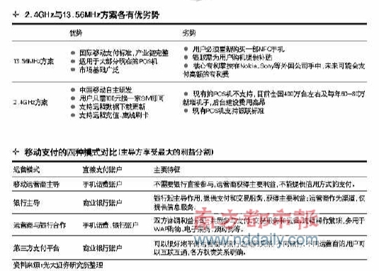 對(duì)此,國(guó)金證券發(fā)布了一份研究報(bào)告稱,相對(duì)于13 .56MHz方案而言,2.4GHz方案在推廣上有先天的優(yōu)勢(shì)。畢竟13.56M H z方案必須對(duì)手機(jī)重新設(shè)計(jì),需要等待手機(jī)產(chǎn)業(yè)鏈對(duì)13.56M H z的逐步支持,時(shí)間周期較長(zhǎng);同時(shí),更換13.56M H z手機(jī)帶來的重置成本無論是由用戶承擔(dān)還是由運(yùn)營(yíng)商承擔(dān)都是一筆高額的費(fèi)用,推廣難度較高。而2.4G H z方案僅需更換SIM卡便可完成對(duì)手機(jī)的改造,不用等待終端產(chǎn)業(yè)鏈的成熟;同時(shí)改造成本低,便于運(yùn)營(yíng)商進(jìn)行促銷推廣。
