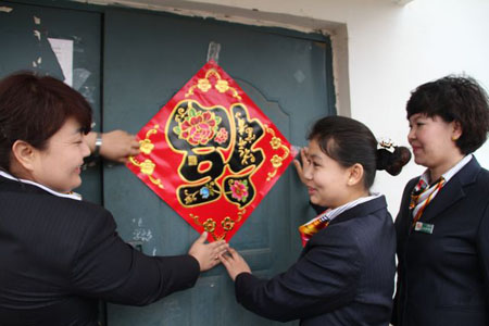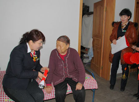 “阿姨,春節(jié)快到了,我們來(lái)看看您,前兩天已經(jīng)幫您把電充上了,這次給您帶了個(gè)手電,用著它以后到地下室可以照個(gè)亮!标(duì)長(zhǎng)阿依古麗向丁阿姨說(shuō)明來(lái)意,還跟丁阿姨試了試,手電是充電式的,不用換電池,丁阿姨挺高興的。臨走時(shí),阿依古麗還在她家門上貼了個(gè)大紅的“!弊郑8@先思倚履昕鞓(lè)。