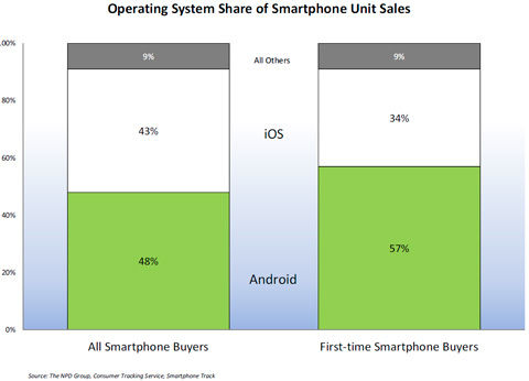 Android和iPhone一共占據(jù)了第四季度智能手機(jī)銷售總量的90%。Android在四季度依舊保持了48%的智能手機(jī)市場(chǎng)份額,同時(shí)Android設(shè)備在首次購(gòu)買智能手機(jī)的消費(fèi)者群中表現(xiàn)更好。根據(jù)NPD每月提供的Smartphone Track服務(wù)的最新數(shù)據(jù),所有在第四季度初次購(gòu)買智能手機(jī)的消費(fèi)者中,其中57%的消費(fèi)者選擇了Android設(shè)備,而相比較下只有34%的消費(fèi)者選擇了iPhone。