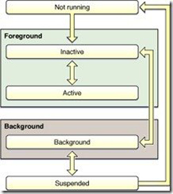 為了節(jié)約電池的電量,智能手機上的操作系統(tǒng)的一個基本策略是,盡量減少正在運行的程序,這個道理很簡單,運行的程序越多,需要耗費的 CPU 計算時間就越多,電量就省不下來。下面的圖是蘋果 iOS 設(shè)備應(yīng)用程序調(diào)度狀態(tài)圖,事實上蘋果設(shè)備是除了用戶正在操作的程序,其他打開的程序進程盡可能都放到“掛起(Suspended)”的狀態(tài)下。在“掛起”的狀態(tài)下面,程序進程處在休眠狀態(tài),不耗費 CPU 計算能力。當(dāng)用戶沒有對設(shè)備進行操作的時候,整個系統(tǒng)處在休眠的低電狀態(tài)。(這里進程的意思是:程序運行實例)
