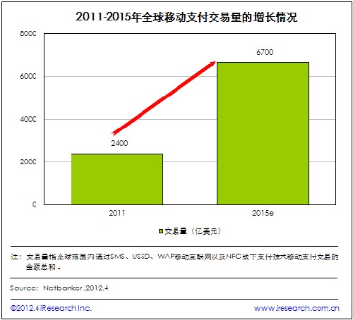 iResearch艾瑞咨詢整理Netbanker的最新數(shù)據(jù)發(fā)現(xiàn),2011年全球移動支付交易量達到2400億美元。該統(tǒng)計數(shù)據(jù)顯示,2015年全球移動支付交易量將達到6700億美元,使用手機銀行應用程序的用戶數(shù)量較2010年將增加45%左右。另外,預計在未來18個月內(nèi)還會有20個國家增設(shè)NFC服務。