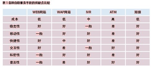 隨著電子化技術(shù)和互聯(lián)網(wǎng)技術(shù)的發(fā)展和普及,各家運(yùn)營商都開始推出各種自助化手段分流人工服務(wù)壓力,改善用戶滿意度。主要的電子化自助手段有WEB網(wǎng)站、WAP網(wǎng)站、IVR語音交互應(yīng)答、ATM自動(dòng)柜員機(jī)。每種自助袷侄味加釁涓髯緣撓湃鋇恪?lt;br />