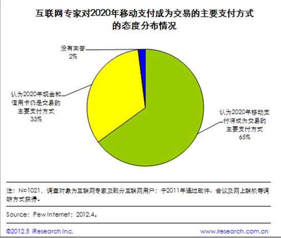 CTI論壇(ctiforum)6月13日消息(記者 楊佳林):據(jù)iResearch艾瑞咨詢整理Pew Internet調(diào)查數(shù)據(jù)發(fā)現(xiàn),多數(shù)互聯(lián)網(wǎng)專家認為2020年移動支付將取代現(xiàn)金和信用卡成為主流支付方式。其中,65%的受訪專家認為到2020年,大多數(shù)消費者將采用智能刷卡終端進行支付;然而33%的專家不贊成這種推測,他們認為到2020年,現(xiàn)金和信用卡將仍然是主要的支付方式,消費者對NFC技術(shù)安全性的擔(dān)憂及主要貨幣電子轉(zhuǎn)換技術(shù)的限制會阻礙移動支付的進一步發(fā)展。