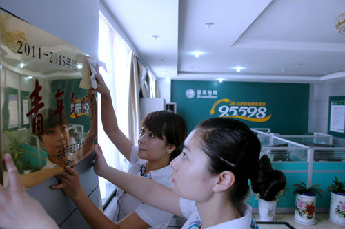 圖為:6 月15日清晨,虞城供電公司95598兩名座席人員在班前對榮譽(yù)匾牌進(jìn)行細(xì)心的呵護(hù)。