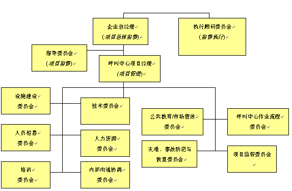 。。對(duì)于呼叫中心建設(shè)項(xiàng)目實(shí)施的規(guī)劃是一個(gè)需要付出巨大心血與努力的階段,這個(gè)階段需要企業(yè)或組織機(jī)構(gòu)所有人員的廣泛參與和專家意見(jiàn)。對(duì)于呼叫中心運(yùn)營(yíng)的規(guī)劃,相對(duì)與呼叫中心建設(shè)項(xiàng)目而言則顯得有些"特殊",它意味著整個(gè)呼叫中心建設(shè)項(xiàng)目團(tuán)隊(duì)不可能有全部的時(shí)間花費(fèi)在運(yùn)營(yíng)規(guī)劃議題上。因此,我們可以將全部項(xiàng)目規(guī)劃工作與任務(wù)拆分成若干個(gè)規(guī)劃細(xì)項(xiàng),這將保證有較強(qiáng)的可操作性。我們建議采取的方式是將整個(gè)項(xiàng)目實(shí)施規(guī)劃團(tuán)隊(duì)拆分成負(fù)責(zé)各個(gè)專項(xiàng)實(shí)施的小組委員會(huì)或附屬委員會(huì)。這些小組委員會(huì)將集中關(guān)注各自特定的項(xiàng)目實(shí)施上,當(dāng)有需要時(shí),與其他各小組進(jìn)行交流與溝通,并在相關(guān)問(wèn)題上達(dá)成一致。按照以上項(xiàng)目組織管理架構(gòu)其目的是,在項(xiàng)目實(shí)施的關(guān)鍵環(huán)節(jié)和領(lǐng)域,能產(chǎn)生出更具深度的規(guī)劃方案。這樣操作同時(shí)可以使更多的人員參與進(jìn)來(lái),并有利于增強(qiáng)各個(gè)小組的責(zé)任感,有助于項(xiàng)目的成功實(shí)施。以下的項(xiàng)目指導(dǎo)委員會(huì)組織架構(gòu)不是任何呼叫中心建設(shè)項(xiàng)目都能適用的,但是它在某種程度上已經(jīng)為呼叫中心項(xiàng)目規(guī)劃提出了一個(gè)基本方針,按照這個(gè)思路它將保證項(xiàng)目的成功實(shí)施。而對(duì)于規(guī)模較小的呼叫中心項(xiàng)目,以上的組織架構(gòu)成員將扮演多重角色,并負(fù)責(zé)多項(xiàng)任務(wù)項(xiàng)目的實(shí)施。就呼叫中心項(xiàng)目規(guī)劃與實(shí)施團(tuán)隊(duì)而言,應(yīng)由若干個(gè)負(fù)責(zé)不同領(lǐng)域?qū)嵤┑男〗M來(lái)組成,以便確保呼叫中心建設(shè)項(xiàng)目的所有領(lǐng)域,及各個(gè)階段的有效實(shí)施。呼叫中心項(xiàng)目規(guī)劃與實(shí)施組織架構(gòu)請(qǐng)見(jiàn)下圖。