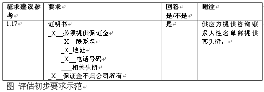 。。在評估的這一部分中通常不給予建議申請的"初步強(qiáng)制性要求"。但是,若不提供基本要求的信息,可能造成停止對某一特定建議評估。圖x中的示范工作表用來檢驗(yàn)供應(yīng)方對這些初步要求的回應(yīng)。