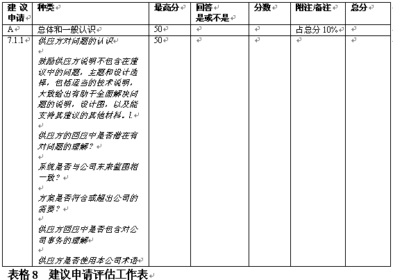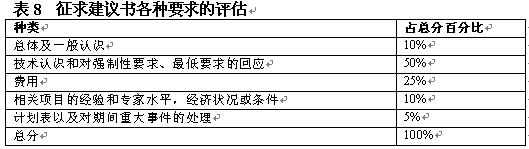 。。在決定了初步要求之后,評估小組應(yīng)具體地開展評估工作。具體評估的目標(biāo)是通過給建議書主要方面打分作出評估。可以在算出建議書各方面占總分?jǐn)?shù)的百分比,如表8中對各方面的總覽。一般在建議書內(nèi)向提供者給出這一信息。