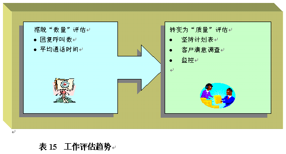 。。這些年呼叫中心工作評估經(jīng)歷了一些變化。最新趨勢是擺脫死板的"數(shù)量"評估,例如回復(fù)呼叫數(shù),通過客戶滿意度調(diào)查和監(jiān)控進(jìn)行數(shù)量評估以外的更全面的質(zhì)量評估。在表14中指出這種最新的工作評估趨勢的原因是,大量數(shù)量評估,例如回復(fù)呼叫數(shù),實際上已經(jīng)不能使員工在其基礎(chǔ)上進(jìn)行改善。例如,一個每小時接聽十個呼叫的員工并不比每小時僅接聽五個呼叫的員工效率更高。呼叫中心管理者評估員工工作更好的辦法是在這種數(shù)量評估中加入額外的質(zhì)量評估。