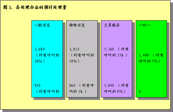 呼叫中心代表每天估計處理16300次呼叫,大約80%呼入呼叫。圖6圖示了人工代表如何處理各種進入呼叫中心的呼叫,以及每種呼叫預計處理時間。全部處理時間包括記錄呼叫相關信息的善后時間。這段時間內代表不能回復呼叫。