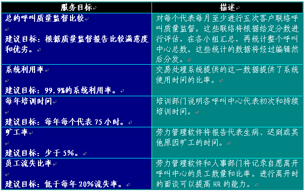 附錄3舉出了完整的衡量標(biāo)準(zhǔn)。這些工作評(píng)估標(biāo)準(zhǔn)可以通過(guò)各種辦法獲得,包括ACD、IVR、客戶關(guān)系管理(CSM)軟件和質(zhì)量監(jiān)督及勞力管理報(bào)告。