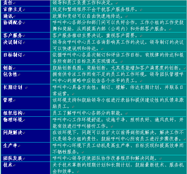 附錄6提供了建議的員工滿意度調(diào)查表?梢宰鳛闇(zhǔn)備制訂呼叫中心使用的版本的起點(diǎn)。在制訂表格時(shí),應(yīng)從所有中心最佳實(shí)踐工作和領(lǐng)導(dǎo)團(tuán)隊(duì)確認(rèn)的其他部門取得評(píng)估要素。表格6總結(jié)了呼叫中心員工滿意度調(diào)查應(yīng)包含的主要方面: