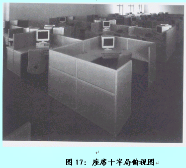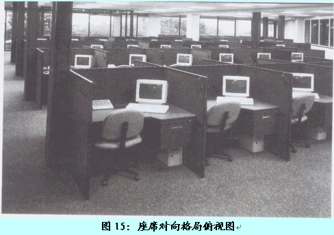 。。在此格局中,客服代表采用兩兩面面相對(duì)的方式進(jìn)行辦公,但位于同一側(cè)的客服代表是相同面向的。