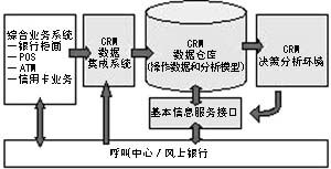 銀行CRM系統(tǒng)一般由業(yè)務(wù)處理、客戶聯(lián)系和客戶關(guān)系分析中心三部分組成。業(yè)務(wù)處理部分指銀行的綜合業(yè)務(wù)處理系統(tǒng),包括柜面業(yè)務(wù)系統(tǒng)、信用卡系統(tǒng)、POS機和ATM機等;客戶聯(lián)系部分由呼叫中心和網(wǎng)上銀行組成;客戶關(guān)系分析中心則以CRM中心數(shù)據(jù)倉庫為核心,通過數(shù)據(jù)集成系統(tǒng)與業(yè)務(wù)處理部分連接,同時為銀行的管理層和業(yè)務(wù)分析人員提供客戶分析系統(tǒng)。