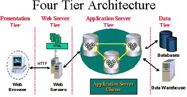 四層架構的四層是指Presentation Tier(表示層)、Web Server Tier(Web服務器層)、 Application Server Tier(應用服務器層)和 Data Tier(數(shù)據(jù)層)四層,其關系如下圖所示。