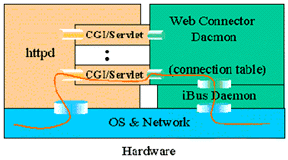 所有來自客戶端的請求(瀏覽器和Applet)都首先發(fā)送給Web Server(HTTP Daemon),然后由httpd啟動相應的CGI/servlet擴展,CGI/servlet模塊僅對上傳的數(shù)據(jù)進行簡單的檢查和打包工作然后就傳給Web Connector Daemon,CGI/servlet模塊本身并不處理連接,它是以一種無連接的方式轉(zhuǎn)發(fā)一個請求再回送應答。連接的維持和記錄由Web Connector Daemon建立起連接記錄表來完成。