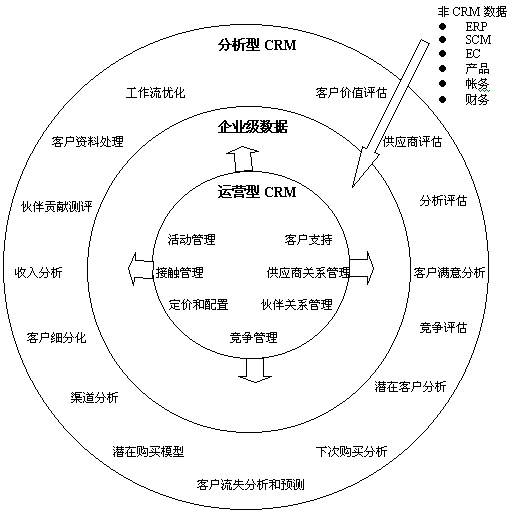 能提供上述問題和其他企業(yè)問題的客戶信息,就能夠對客戶服務、銷售技巧和隨后的促銷戰(zhàn)略作出關鍵決策。通過對“運營型”CRM數據與來自于全公司的信息進行集成,公司便能夠開始執(zhí)行分析型CRM;并且執(zhí)行后,可以作出真正的“以客戶為中心”的企業(yè)決策。