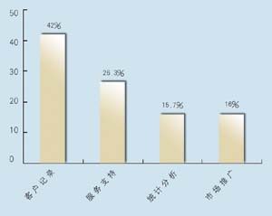 關(guān)于所應(yīng)用的CRM類型,有5家是呼叫中心,5家是分析型,7家是運營型,2家是屬于大型企業(yè)CRM。其中13家擁有動態(tài)客戶數(shù)據(jù)庫,占到68.4%。這其中又有42%利用數(shù)據(jù)庫作客戶記錄,26.3%作為客戶支持使用,15.7%用作統(tǒng)計分析,另有16%作為市場推廣。保險公司與客戶聯(lián)系的方式,從重要性來看依次為:面對面\電話\網(wǎng)絡(luò)\傳真,這說明保險公司對于與客戶進行人性化交流的重視。在問到CRM的主要作用時,有5家表示使用CRM有助于保險業(yè)了解自身的經(jīng)營情況,幫助公司準確地發(fā)現(xiàn)贏利客戶和具有贏利潛力的客戶,有7家認為使用CRM有助于分析客戶的消費傾向,有7家認為使用CRM有助于優(yōu)化信息和資源管理。在問到是否愿意為像CRM系統(tǒng)這樣的咨詢或服務(wù)付費時,有11家表示愿意,占到57.8%。