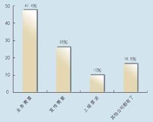 在問到對CRM的熟悉程度方面,有12家表示熟悉,占到63.2%,另有7家表示不熟悉,說明許多企業(yè)已經(jīng)對CRM有一定了解,不過也仍有相當大的市場空間。其中有8家建立了CRM系統(tǒng),占到42%,計劃建立的有9家,占到47.4%,而有2家表示短期不會建立。從調(diào)查發(fā)現(xiàn),幾乎所有受訪者都接受和認同CRM,盡管有一些企業(yè)還不熟悉,但在調(diào)查問卷中對此表現(xiàn)出極大的興趣。在CRM的采購動機上,有9家表示是為了提高業(yè)務(wù),占到將近一半的比例(47.4%),而有5家表示出于企業(yè)宣傳,2家屬于上級主管部門要求,有3家表示是出于同行的示范。調(diào)查顯示,企業(yè)獲得CRM的信息來源很廣,最多的是通過報刊雜志的廣告,有6家,占31.6%,而上級推薦和供應(yīng)商推薦各有4家,各占21%,有兩家是集成商推薦,此外還有3家通過展會獲得相關(guān)信息。