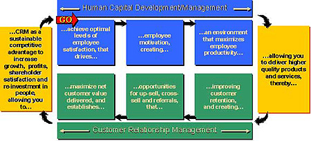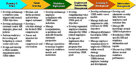 下面的圖表表示的是相對(duì)于特定CRM考慮的HR價(jià)值鏈。通往成功的CRM的道路無(wú)疑將從“人”中穿越而過(guò)。