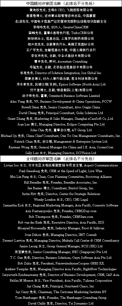 五、 權(quán)威性。GreaterChinaCRM邀請(qǐng)?jiān)摍C(jī)構(gòu)50多位(包括中國(guó)和外國(guó))最權(quán)威的CRM專家擔(dān)當(dāng)此次評(píng)選的評(píng)審團(tuán)。