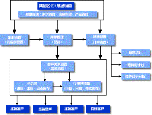可以通過銷售統(tǒng)計(jì)查詢某個(gè)產(chǎn)品、某地區(qū)的下級(jí)分銷商、到某個(gè)下級(jí)分銷商的銷售情況,還可形成周/月報(bào)表。
