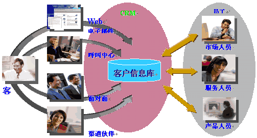 CRM是在90年代,隨著Internet的發(fā)展成熟起來(lái)。它充分利用了Internet技術(shù),通過(guò)電話中心、網(wǎng)站、電子郵件、移動(dòng)技術(shù)的使用,提供客戶多種形式的渠道,完成銷(xiāo)售、服務(wù)、市場(chǎng)等多種職能和流程,滿足客戶不同種類、不同層次的需求。這些渠道全方位地收集客戶信息,并通過(guò)集中的數(shù)據(jù)庫(kù)進(jìn)行管理和共享。而數(shù)據(jù)挖掘技術(shù)幫助企業(yè)進(jìn)一步分析客戶需求,提供決策支持。如下圖(資料來(lái)源:Siebel公司)。