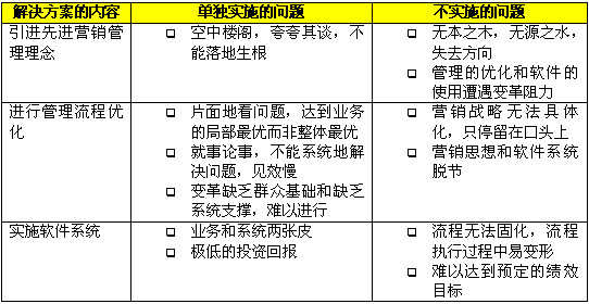 在CRM出現(xiàn)以前,企業(yè)為了解決市場(chǎng)、銷(xiāo)售和服務(wù)方面的問(wèn)題,更好地吸引、獲得、保留和發(fā)展客戶,采取了各種方式,比如使用一套分銷(xiāo)管理的解決方案,或者請(qǐng)"點(diǎn)子公司"出謀劃策,或者尋求某個(gè)具體業(yè)務(wù)的優(yōu)化。以上這些做法往往只能完成局部的改進(jìn),或取得短期的效果,無(wú)法形成長(zhǎng)期和整體的競(jìng)爭(zhēng)優(yōu)勢(shì)。原因就在于這些解決方案都只提供了片面的、局部的解決方案,"頭痛醫(yī)頭,腳痛醫(yī)腳"不能綜合管理理念、業(yè)務(wù)流程和技術(shù)應(yīng)用這三個(gè)方面,系統(tǒng)地分析和解決問(wèn)題。下表中分析了這些解決方案單獨(dú)實(shí)施或者不實(shí)施會(huì)帶來(lái)什么問(wèn)題。