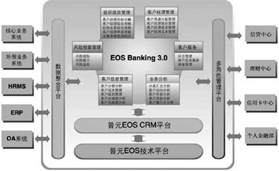 普元公司順應(yīng)中國(guó)銀行業(yè)發(fā)展的趨勢(shì),綜合國(guó)內(nèi)外金融業(yè)的市場(chǎng)營(yíng)銷(xiāo)和管理模型,把具有世界級(jí)水平的EOS平臺(tái)推廣到銀行業(yè),提供具有中國(guó)特色的“EOS銀行客戶(hù)經(jīng)理管理系統(tǒng)”。這套系統(tǒng)可以幫助銀行快速組織資源,面向客戶(hù)提升客戶(hù)服務(wù)、市場(chǎng)營(yíng)銷(xiāo)水平,同時(shí)對(duì)客戶(hù)經(jīng)理的業(yè)績(jī)考核加強(qiáng)管理,為客戶(hù)經(jīng)理提供風(fēng)險(xiǎn)控制工具,為營(yíng)銷(xiāo)主管部門(mén)決策提供支持。最終實(shí)現(xiàn)幫助銀行達(dá)到提高利潤(rùn)、降低成本,提高銀行客戶(hù)滿(mǎn)意度及提高市場(chǎng)占有率的管理目標(biāo)。