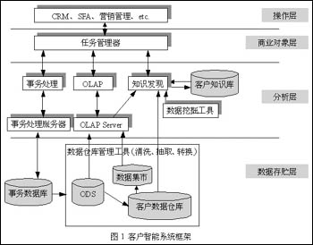 圖1描述了一個(gè)典型的客戶(hù)智能系統(tǒng)體系結(jié)構(gòu)。面向特定的應(yīng)用,客戶(hù)智能的體系結(jié)構(gòu)會(huì)有所改進(jìn),以使系統(tǒng)與具體的業(yè)務(wù)相符。例如:建立何種數(shù)據(jù)存貯和數(shù)據(jù)模型能很好地支持主題,支持客戶(hù)數(shù)據(jù)分析和客戶(hù)知識(shí)發(fā)現(xiàn)的需要;選擇何種決策分析工具;將發(fā)現(xiàn)的客戶(hù)知識(shí)通過(guò)何種接口傳送給相應(yīng)的用戶(hù)等等,都需要實(shí)際情況結(jié)合起來(lái)考慮。