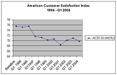 再看美國客戶滿意度指數(shù)(ACSI)的統(tǒng)計(jì),顯示客戶滿意度正在逐步下跌,考慮到這一點(diǎn),很明顯可以看出人們正越來越脫離客戶的本質(zhì)。