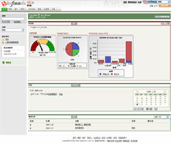 布局為上下型,頁面的模塊化構(gòu)成感覺很明顯。首頁上的模塊包括:最近安排、電子郵件提醒、任務(wù)提醒、日歷和商機(jī)階段的統(tǒng)計圖。也提供了在系統(tǒng)中新建數(shù)據(jù)的快捷入口,和最近察看數(shù)據(jù)的提示。另外,直接新建聯(lián)系人也被作為一個重要功能放置在首頁。